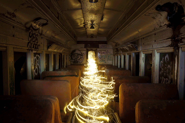 Ong’s latest piece, “HALO,” relies on an existing architectural structure to provide a site-specific framework. Beams of light appear to permeate stone and concrete, simultaneously contained by the buildings yet impervious to their solidity.