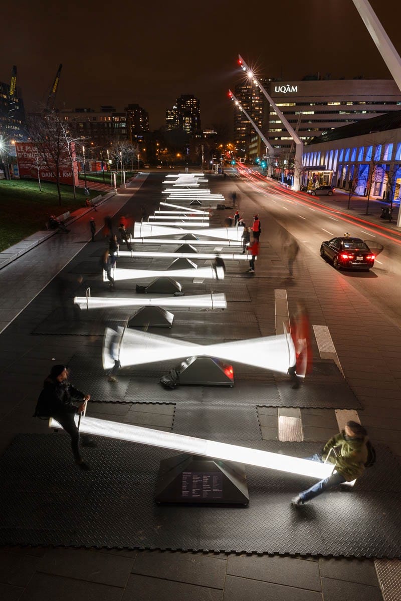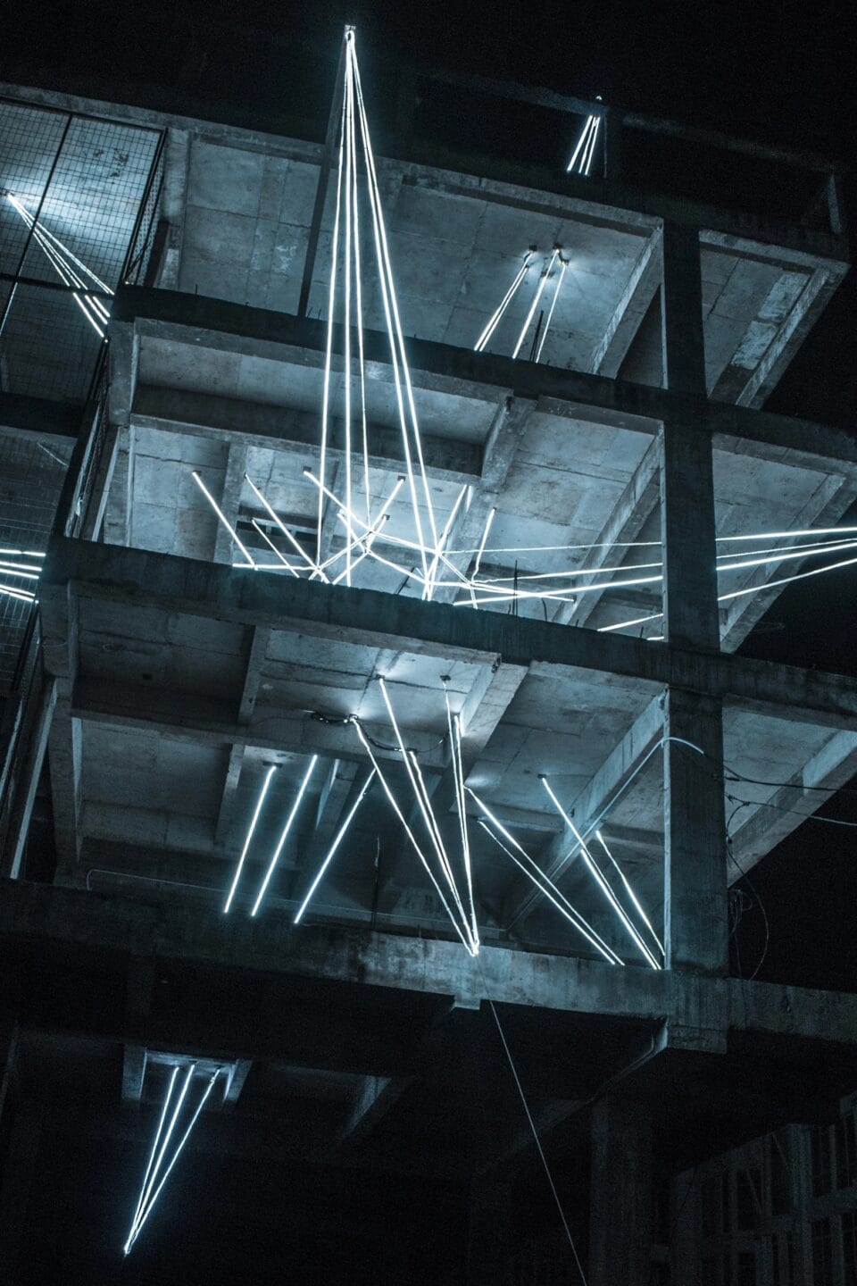 He says, “Using only two materials—tensile steel cables and LED strips—I manipulated light and architecture to create a colossal object that seemingly burst out of the building like a glitch in time.”