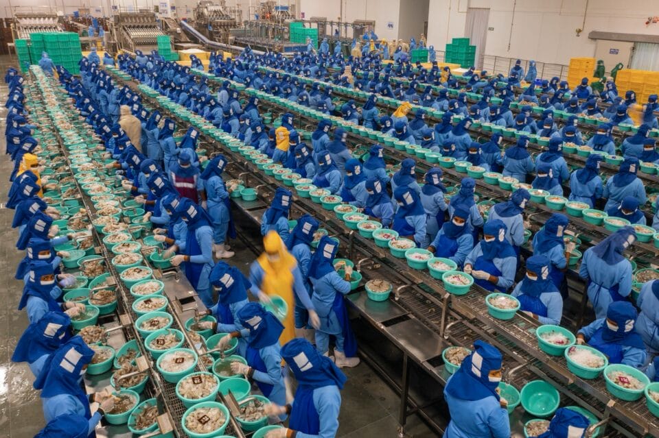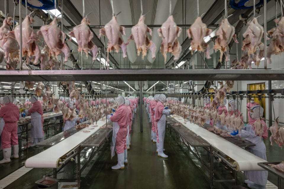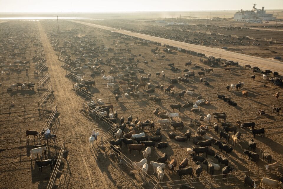 Mauritania was a country of pastoral nomads when it gained independence from France in 1960, but it has since become a nation of fishermen as well, with hundreds of pirogues lining the beach of the capital of Nouakchott. The official annual national landings are around 900,000 tons, but researchers who include illegal or unreported hauls put the catch at more than twice that. With many fish stocks moving north and farther offshore as sea temperatures rise, the competition for fish turned violent in 2023 in neighboring Senegal, where fishermen from the town of Kayar burned drift nets illegally set by fishermen from Mboro in the Kayar Marine Protected Area. In response, the Mboro fishermen attacked Kayar boats with gasoline bombs, killing one boy and wounding twenty others. Government intervention prevented an outright civil war between fishing groups, but tensions are endemic to communities that have grown dependent on declining natural resources. Some 600,000 Senegalese are now employed in fisheries. Fish are a primary source of protein for both Mauritania and Senegal. Working one shrimp at a time, women workers at Avanti Frozen Foods in Yerravaram, Andhra Pradesh, India, can de-shell and de-vein up to 44 tons of farmed shrimp per day from the company’s 1,600 acres of shrimp ponds. Avanti is one of the largest shrimp exporters in India, which dominates the global shrimp export market. About 75 percent of its frozen shrimp is exported to the U.S., with Costco being one of its major customers. Shrimp is the most valuable traded marine product in the world, with an estimated market value of nearly $47 billion in 2022.Modern cowboys conduct wellness checks on horseback at the Wrangler Feedyard in Tulia, Texas, home to around fifty thousand head. Wrangler is one of ten feedlots in Texas and Kansas owned by Amarillo-based Cactus Feeders that collectively can provide feed and care for a half million cattle. At the Wrangler facility, cattle arrive at around 750 pounds, then spend five to six months eating some 20 pounds of dry feed and fodder each day until they reach slaughter weight. Cactus sends more than a million head to slaughter each year, typically to the Tyson beef processing plants in Amarillo, Texas, and Holcomb, Kansas. According to the Texas Farm Bureau, there are more cattle on feedlots within 150 miles of Amarillo than any other area in the world.Just as almond milk has displaced cartons of dairy milk in the grocery store, an old Aermotor windmill that once pumped water for cattle now looms over rows of almond trees and beehives that replaced them near Oakdale, California. The rising popularity of nut milks and almonds for snacking both in the U.S. and overseas has led California growers to triple their acreage in almonds since 1995. Almond orchards now cover 2,500 square miles in the state, growing 80 percent of the global supply and worth more than $5 billion in annual sales. Like cattle, almond trees need copious amounts of water—about 1.1 gallons per nut—as well as hardworking honeybees to pollinate the crop, both of which are in increasingly short supply.A few of the 2,000 workers at the CP Group’s chicken processing plant in Jiangsu, China, prepare broilers for the domestic market, including fast food chains like McDonald’s, KFC, and Burger King. On a typical day they process 200,000 birds and double that number prior to Chinese holidays.Men and women of all races, classes, and religions enjoy a free hot meal at the Sri Harmandir Sahib, better known as the Golden Temple, in Amritsar in Punjab State, India. The gurdwara is the holiest site of the Sikhs, as well as the world’s largest langar, or community kitchen, which provides a free, hot vegetarian meal to 100,000 people, 24/7, all year. The meals consist of roti, or Indian flatbread, rice, a curried vegetable dish, and dal, or lentil soup, which is cooked in giant wood-fired cauldrons in four-ton batches paid for by donations and cooked and ladled out mostly by volunteers. Such langars are a part of every Sikh temple and serve an estimated seven million free meals around the world as an act of charity to all visitors each day.