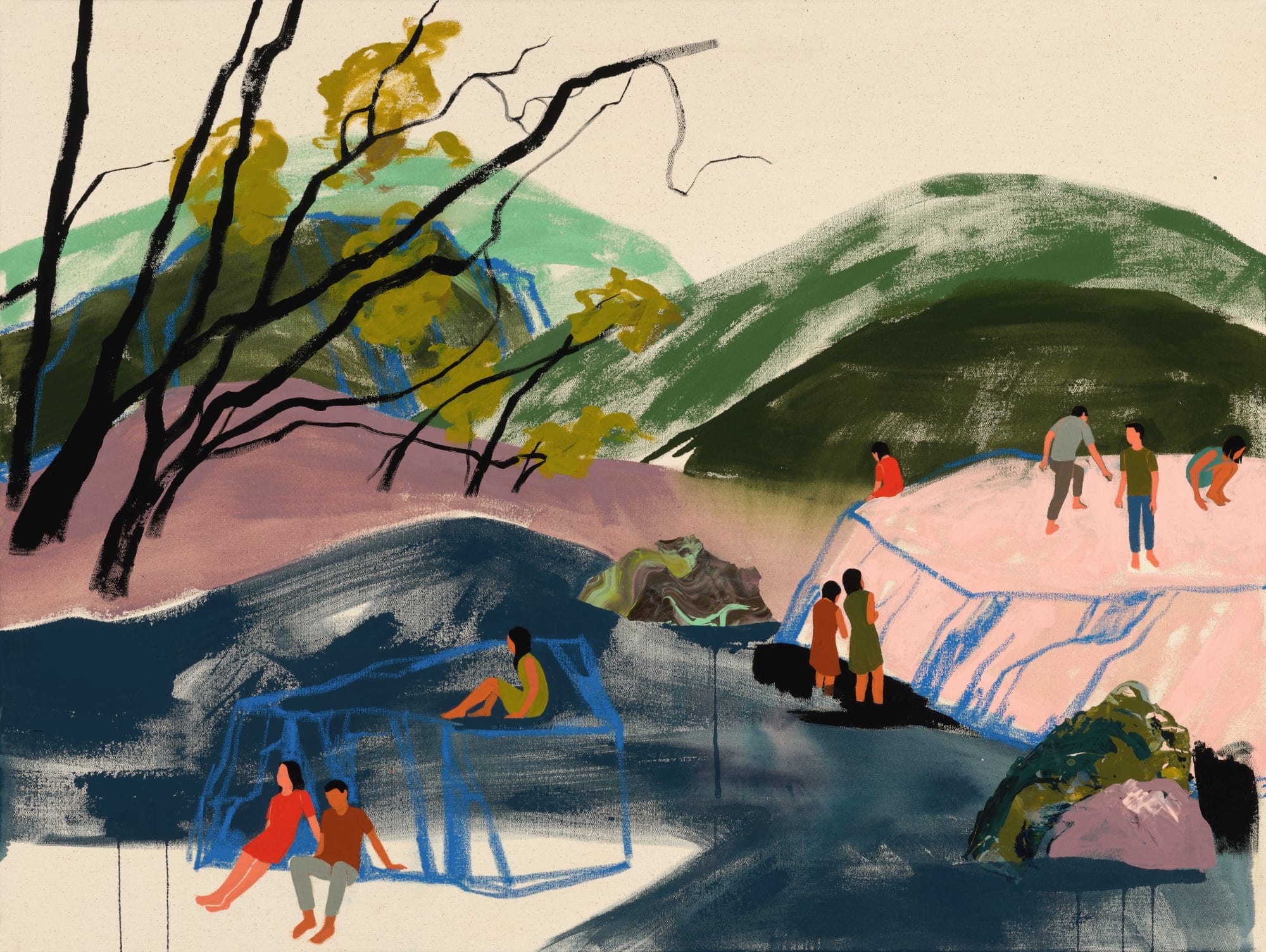 With barren trees, colorful mounds, and diminutive figures ambling among the terrain, the paintings emphasize the ways the past emerges in the present. Despite their bright hues, Hong’s landscapes are deteriorating and experiencing the very real blight of climate disaster. Two new pieces depict figures in the parched Atacama desert, clambering atop enormous heaps of discarded clothing. Bringing the immense waste of fast fashion and consumerism to the fore, the compositions capture the ways our decisions are never relegated to the past and how our choices affect even the most sparsely populated regions on the planet.