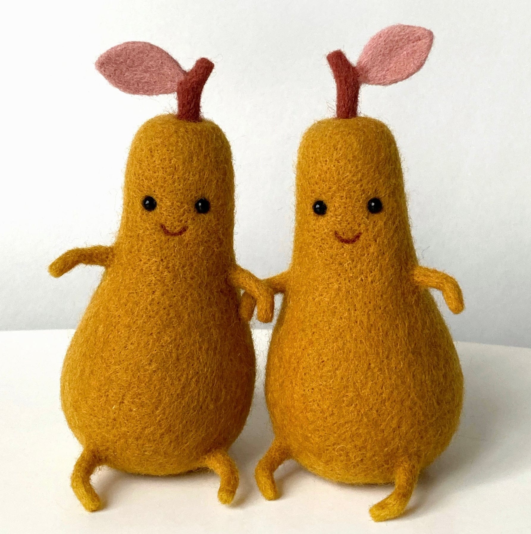 Olha and Hanna Dovhan are the creative minds behind the adorable felt sculptures of Manooni (previously). Whimsical and endlessly cheerful, the small family units, pairs of pears, and coupled avocados are needle felted with wool and finished with tiny grins.