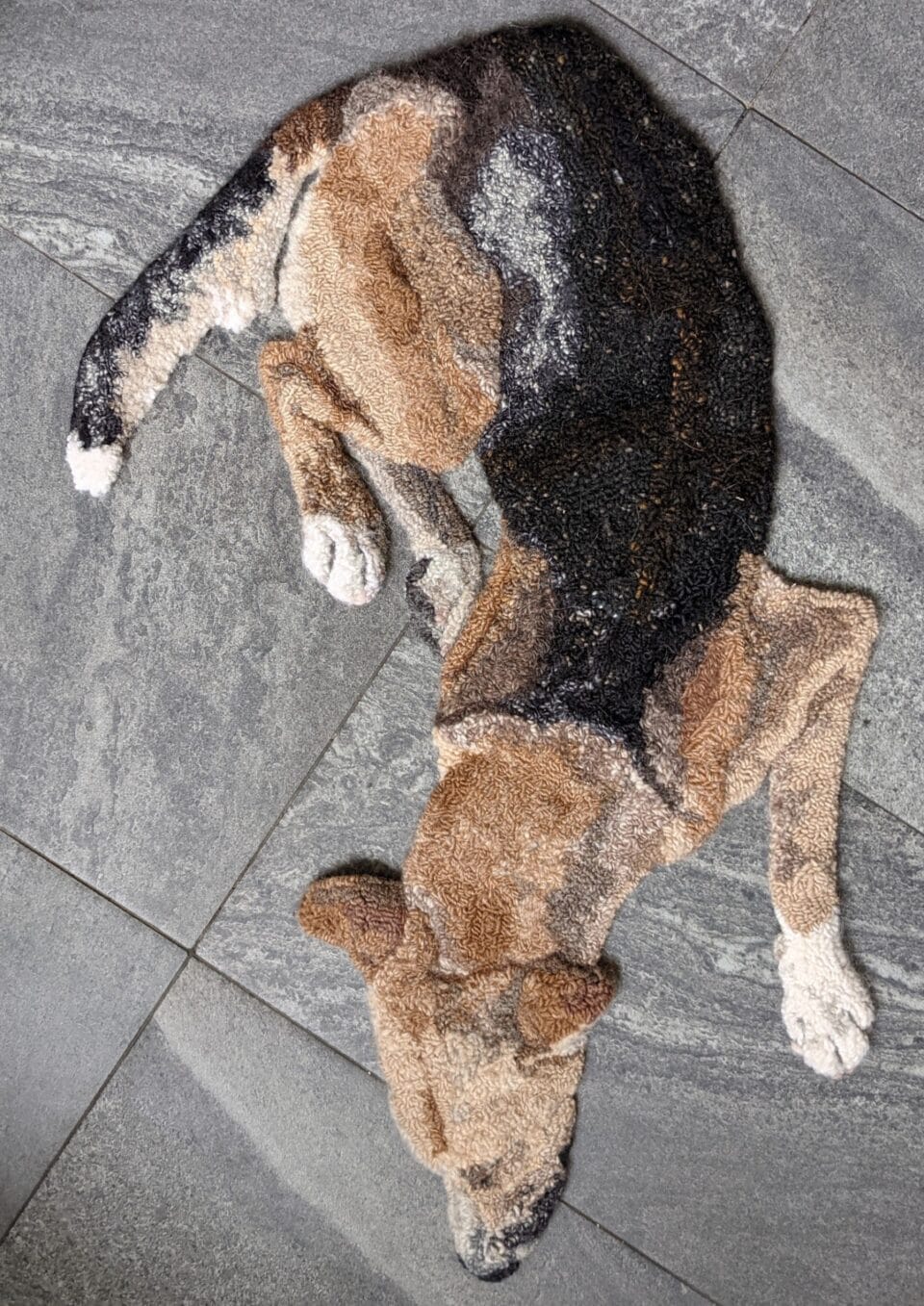 Based on photographs of actual dogs, she focuses mostly on animals the artist doesn’t know. “I like to hook dogs that are pretty ‘mutty’ looking, that don’t look like yard-bound Golden Retrievers or Doodles,” she tells Colossal. “I’m attracted to the shared history of humans and dogs—how the bulk of their domestication may have happened somewhat inadvertently.”