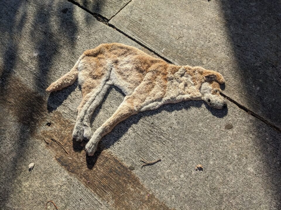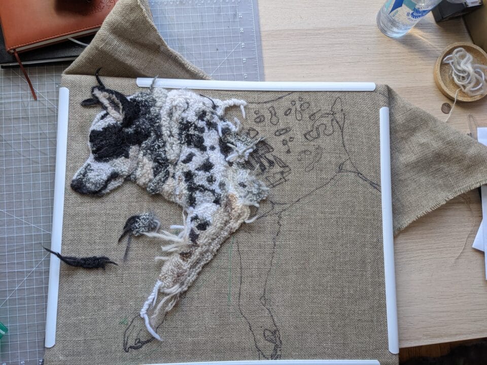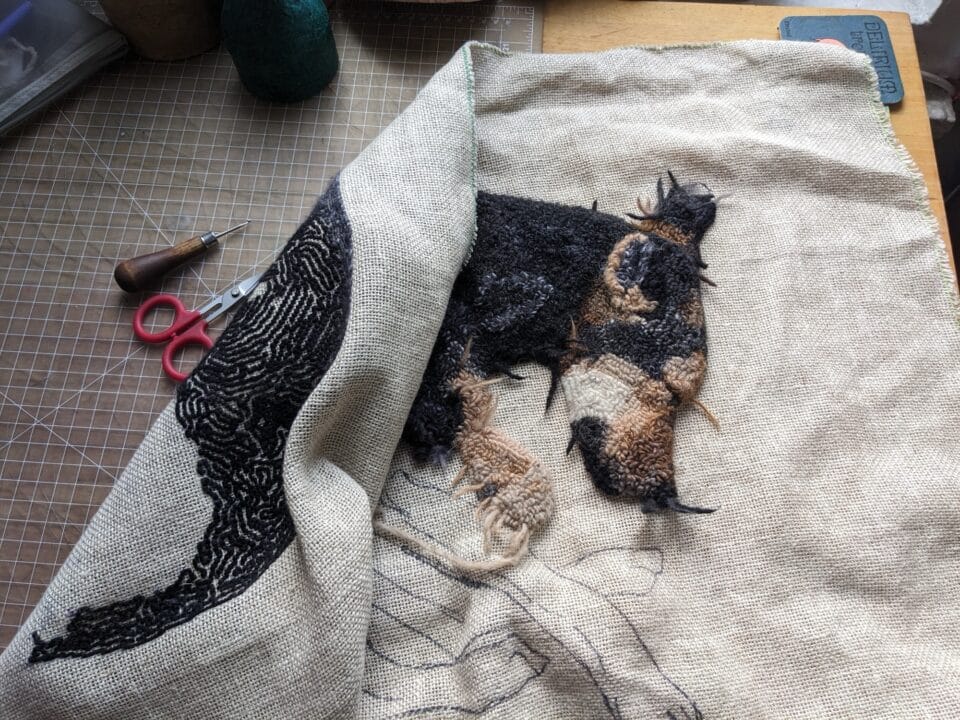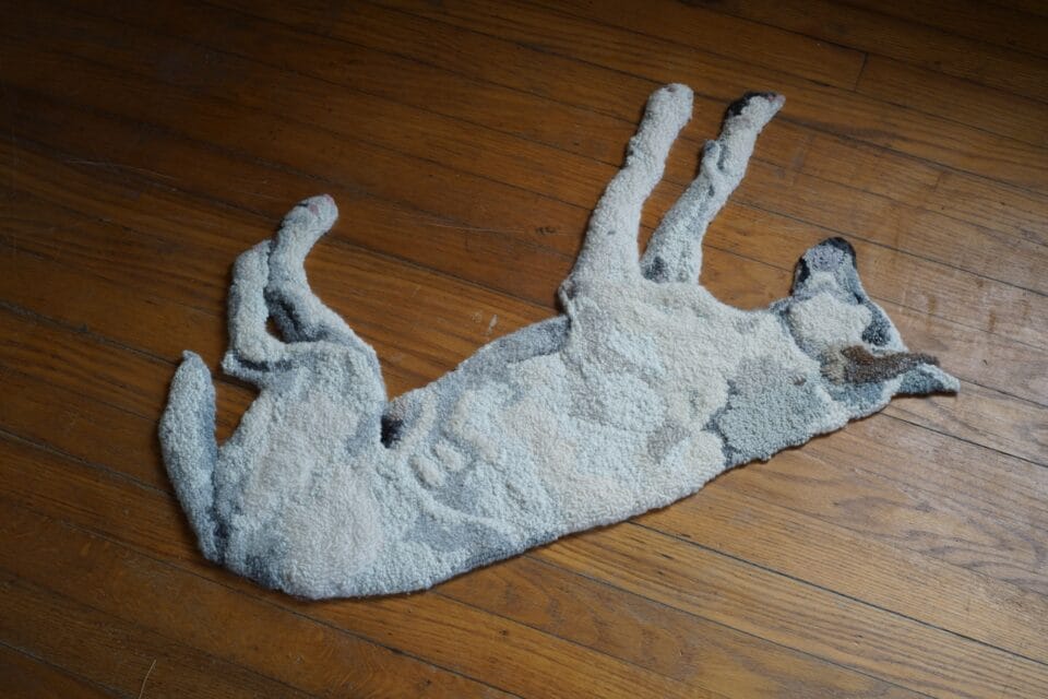 The pieces’ weight and realistic details engender an intimate connection as they come to life, so to speak. “I really feel like I’ve built a relationship with the object,” she says, adding: “Sometimes the dogs I hook have wounds or scars. The dog rug I’m working on right now is missing a little chunk of her ear. I want to depict them as they are, not stuffed animal versions.”