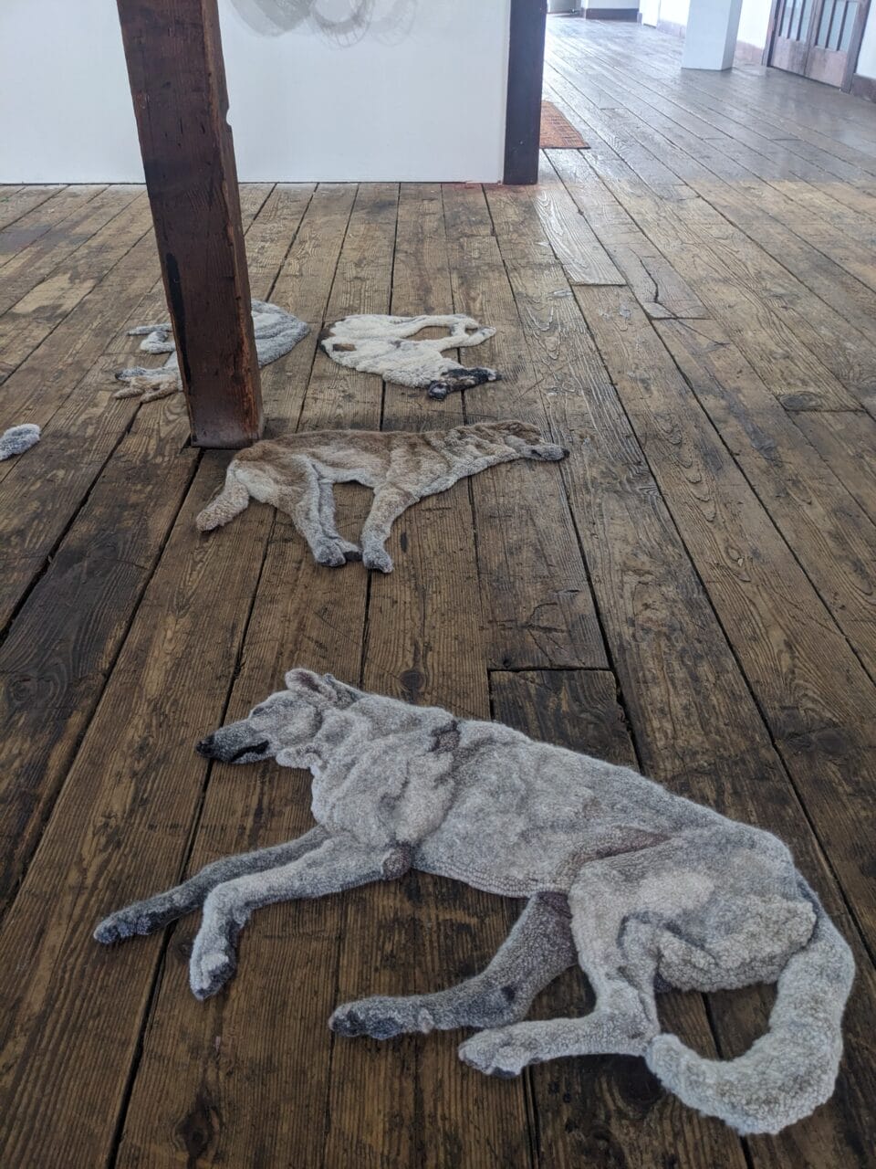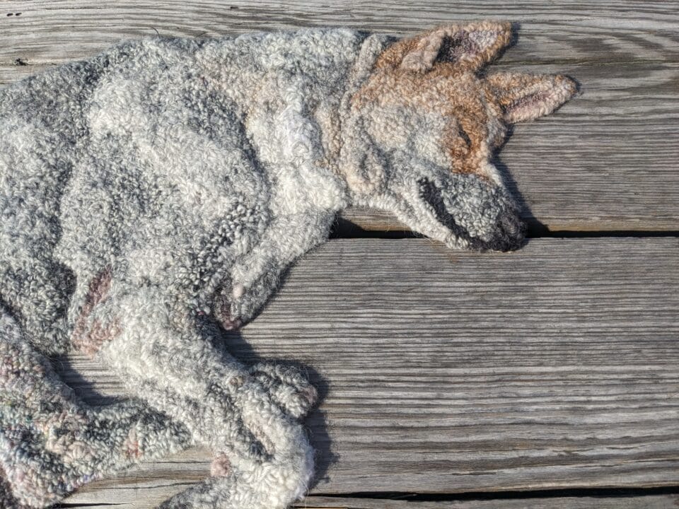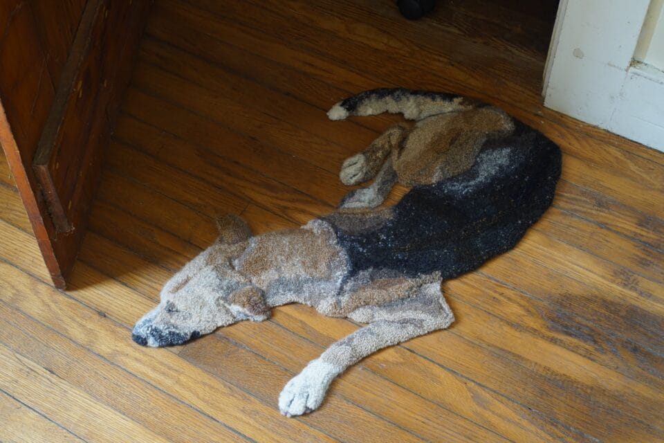 Lifelike Canines Lounge in Emily O’Leary Uncanny Hooked Rugs