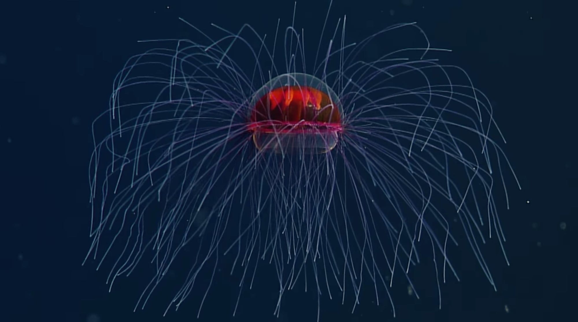I attached tentacles with varying widths, following rhythmic patterns that abstractly echo the textures of jellyfish tissue…For the top portion of the jellyfish, I employed a smooth, overlapping layering technique, which mimicked the delicate, rounded bell of the jellyfish. For the base, I used an opposing technique, where the pieces were knitted with the edges facing each other, resulting in a ridged texture that evoked the intricate, flowing form of jellyfish tentacles.